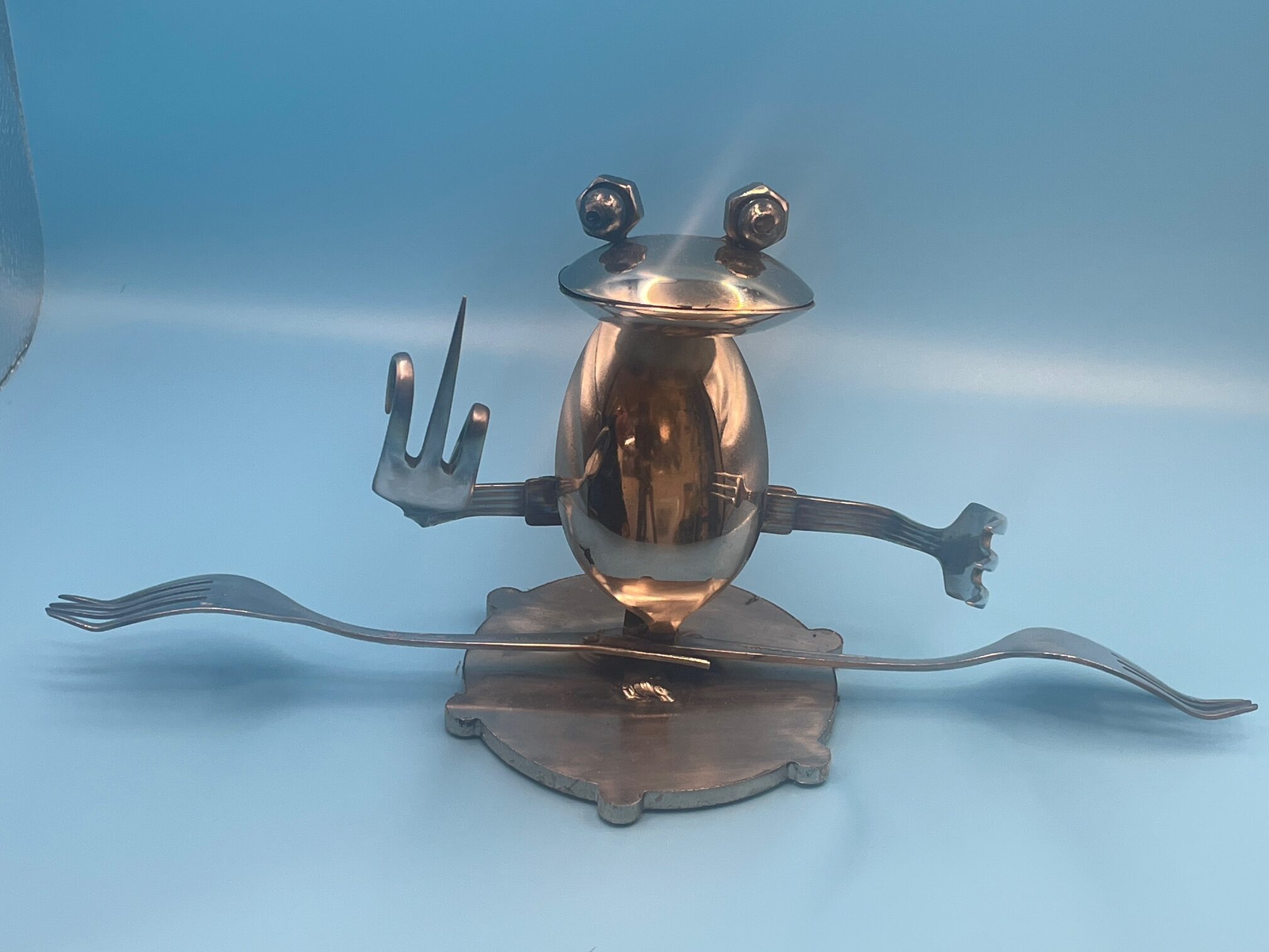 A unique, free standing frog sculpture handcrafted from recycled spoons, forks and metal nuts. This quirky caricature has a polished metal finish and plenty of personality, making it a great conversation piece for home, garden room, or office decor.