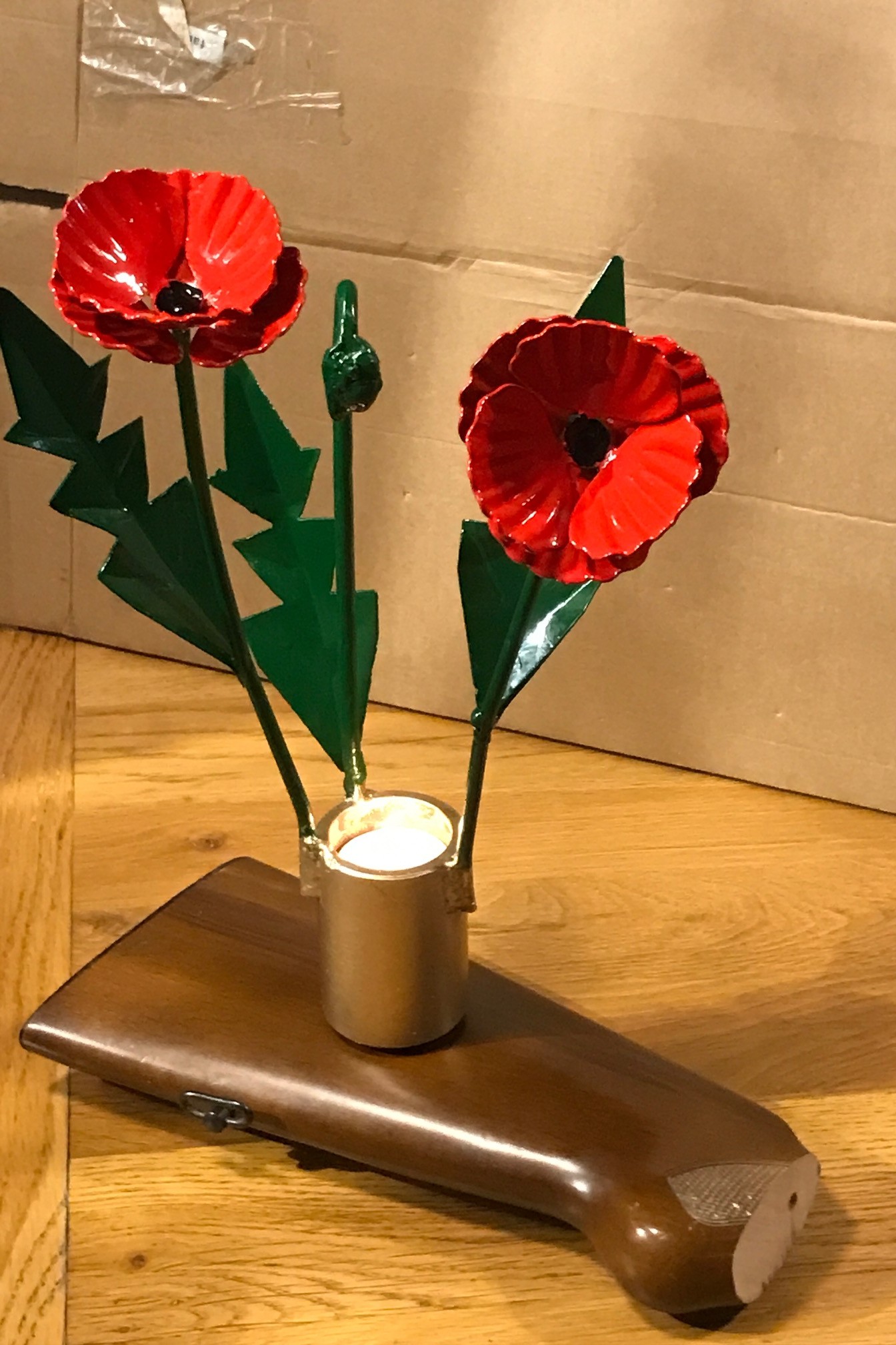 3 Poppies welded on to a holder that fits a 40mm tea light Mounted on a riffle gun butt by a threaded bolt in the tealight holder